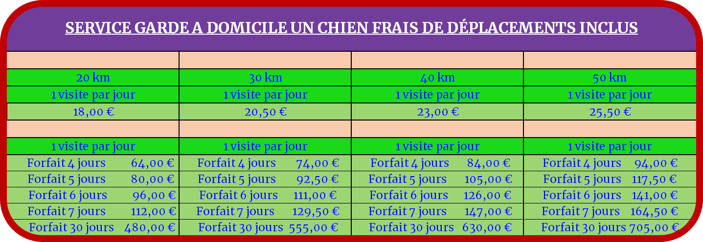 - Le tarif de la visite sans frais de déplacements est de 13 euros pour la garde d’un chien, à partir de deux chiens nous consulter